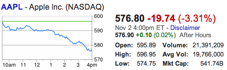 Apple’s stock has been on quite the dip this past month, losing 125 points in 41 days, and falling from a high of over 700 on iPhone 5 launch day. For those who took some analysts’ advice bought at October highs,that’s got to sting. Today, the stock sits at 576, unfathomably low for those left to deal with their stock having lost over $100B in market cap.