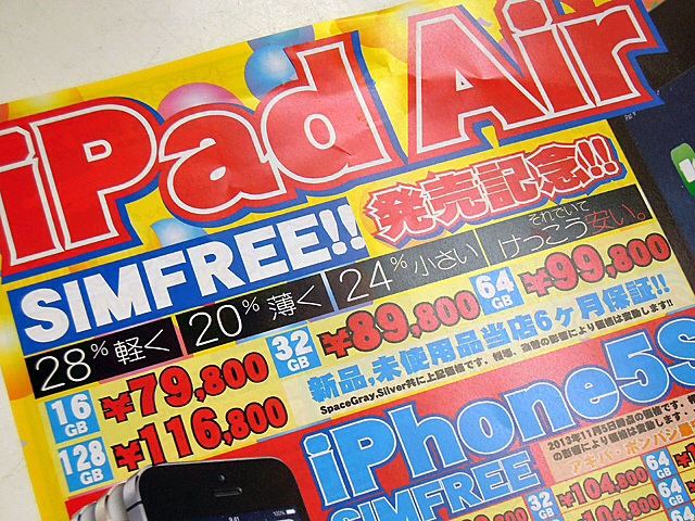 早くも iPad Air SIM free model Apple 2013年11月09日 SIMフリー仕様の海外版「iPad Air」が、イオシス アキバ中央通店に入荷した。ただし、初回入荷分は完売で、次回入荷は早ければ今週末~来週頭初めとのこと。入荷したのは、ストレージ容量16GB/32GB/64GBの3モデルで、カラーはスペースグレイとシルバー。128GBモデルも今週末~来週に入荷する予定とのこと。なお、ソフトバンクとauから発売されている国内向けセルラーモデルはこれまでと同様にSIMロック仕様となっているため、今回入荷したSIMフリーモデルは、複数のSIMカードを使い分けたい人には注目の製品と言えるだろう。ただ、同店によると「技適マークの有無は不明で、通信機能に関するサポートや保証は一切しない」とのこと。モバイル通信機能の利用は自己責任となる点には注意が必要だ。価格は、16GBモデルが79,800円、32GBモデルは89,800円、64GBモデルが99,800円。また、近日入荷予定の128GBモデルの予価は、116,800円となっている。「iPad Air」のSIMフリーモデルが早くも登場! アキバ総研 | 2013年11月07日 19:30 [0回]PR