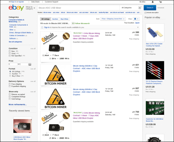 bitcoin の採掘(mining)は、自分でするな。 Web関連 2014年01月11日 Bitcoin(以下、BTC)の知名度アップとともに、こぞって投機熱が加速している。2014年1月11日16:46現在、1BTCは939USD(約10万円)程度で取引されている。今から買うには少々乗り遅れている気がしてならないが、BTCの取引はリアル世界で取引している政府発行通貨と違い、全埋蔵量の設定によってその希少性が担保される。miningに参加し、暗号を解読する人間が増えれば増えるほど、その暗号の解読も難化し,さらに高スペックな処理能力を有するコンピュータがないと太刀打ちできない。という仕組みになっているため、素人が使うPC、あるいはネットで出回るUSB Asic miner程度ではかけたコストを回収できるだけの利益は、到底期待できないだろう。 そこで、一番手っ取り早く、低リスクでminingを楽しむ手段がeBayに登場した。[発掘請負契約]だ。(mining contract) 試しに、eBayで実際にmining contractをやってみた。2013.12.29~2014.1.2にかけて、700GH/sのスピード(現時点ではかなり高スペック)Contract 700GH/S bitcoin mining knc avalon butterfly labs asic minerを4時間で119ドル(現在は139ドルに値上げされた)を3回支払って、請負契約を結んだ。【詳細】BTC Guild(https://www.btcguild.com)のプールに参加(Pool Speed 3,271 TH/s)・3回12時間、700GH/s・支払:357ドル(時価換算:約37,128円)・結果:0.10509816BTC(時価換算:約10,510円)つまり、現時点では700GH/sをもってしても1/3のパフォーマンスしか得られないことがわかった。しかしながら、Mt.Gox(https://www.mtgox.com/)を利用して、トレーディングを始めてみるきっかけができた。マシンを購入する前に、一度、mining contract(採掘契約)を結んでみるとコスパがわかるだろう。ちなみに、この計算からすると、現在売り出されている最高のスペックを誇るマシンを購入し,自腹で電気代も含めてリスクを取った場合、どのくらいで元が取れるのか?当然、時間が経過すればするほど、採掘参加者も増え、さらなるマシンの増強も加味しなくてはならない。【マイニング専用マシン性能を比較したサイト】Minr - keep track of bitcoin ASIC mining hardwarehttp://minr.info/処理可能なハッシュ数や一日あたりのビットコイン発掘数,そして投入したコストが何日で回収できるか、ということが表にまとめられ,項目ごとにソートすることも可能になっており非常に便利だ。【現時点でのモンスターマシンの紹介】Neptune Second Batch 3TH/s$ 9,995.00約104万円(1ドル=104円換算:2014.1.11)1日あたり、1BTC採掘可能。ペイするには約11日ほど。必要電力2100ワットもコストに入れても、今のところは充分。間違っても、USB Asic minerは買わないほうがいいでしょう。まだ、こちらのほうがマシかも。 [0回]PR